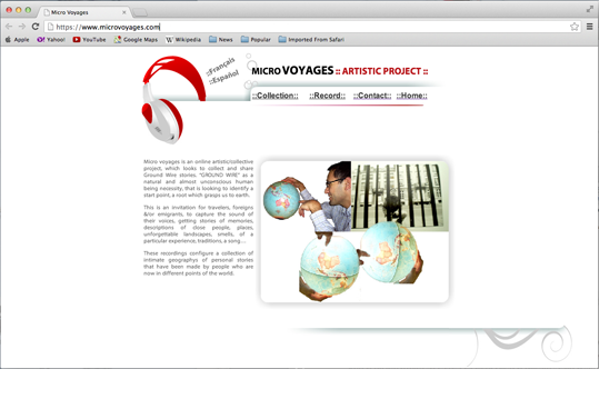 Microvoyages es un proyecto artístico colaborativo, dedicado a recopilar y a compartir historias de "polos a tierra": El Polo a tierra entendido como una necesidad natural y casi inconsciente de los seres humanos por identificar un punto de origen, - experiencias vividas y raíces que nos atan a una tierra-. Esta fue una invitación a viajeros, extranjeros y/o emigrantes, a registrar historias de recuerdos, descripciones de seres queridos, de un lugar visitado, de un paisaje inolvidable, de un olor, de una vivencia... que lo anclen a una tierra. Estos registros sonoros configuran una colección de geografías íntimas de historias de personas que han hecho desplazamientos y que hoy se encuentran en diferentes lugares del mundo.